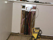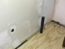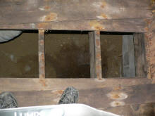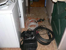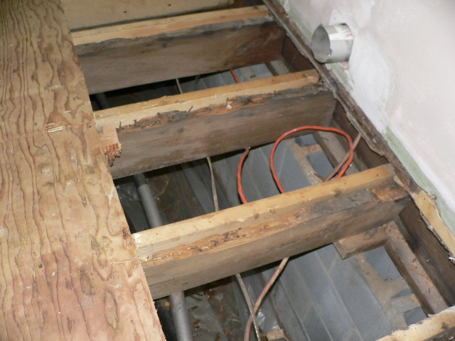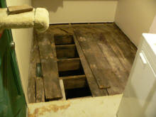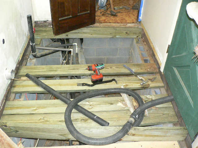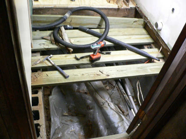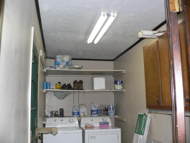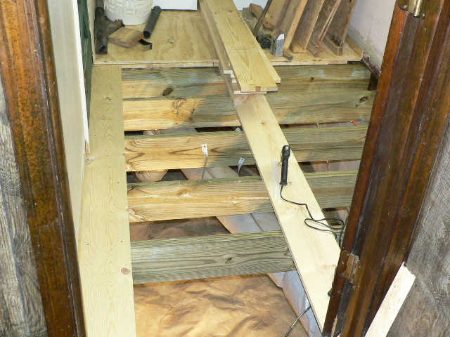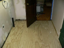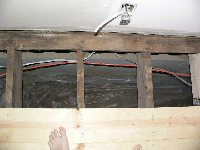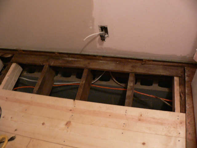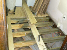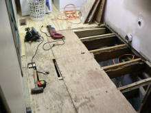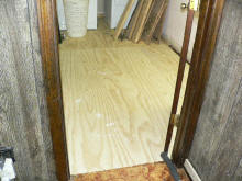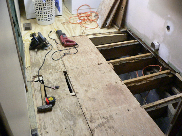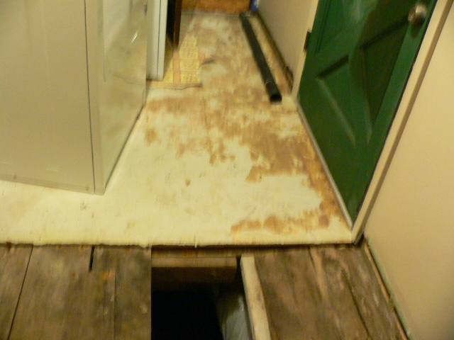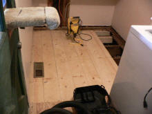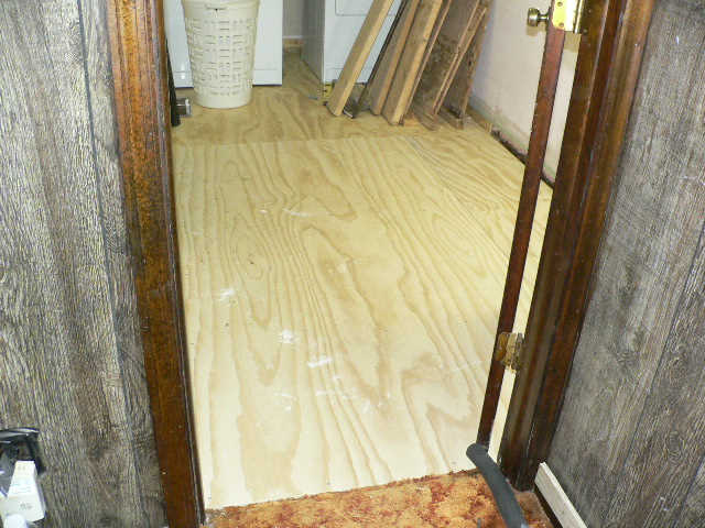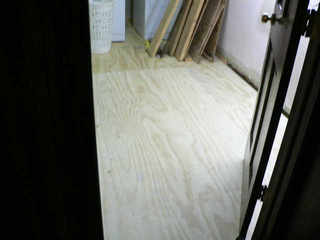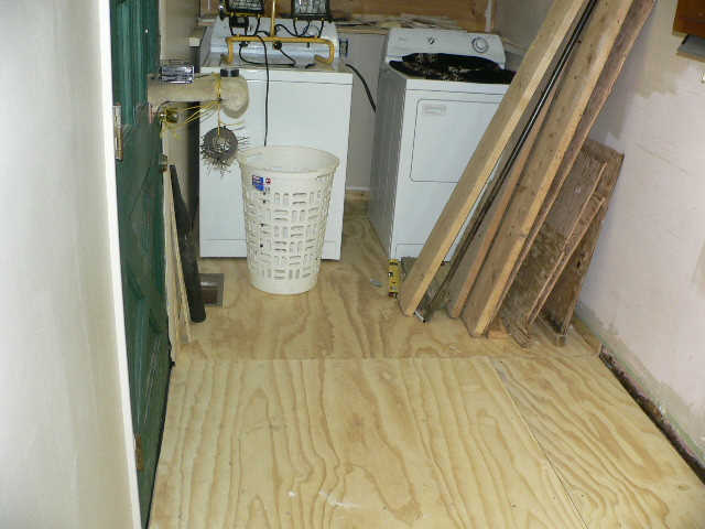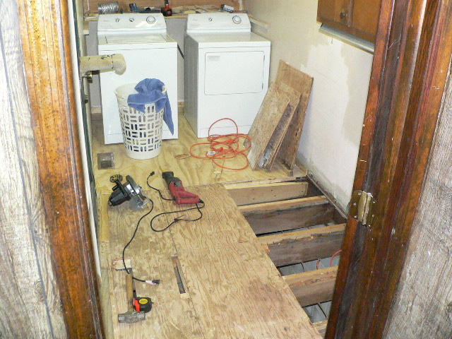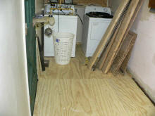 Laundry Room Floor Jan, 2007 I started to paint the laundry room and ended up replacing the rafters, sub floor and floor. I am over half done, but it really is much more than I expected. I also moved the washer and dryer to the end of the room so they needed plumbing and electricity moved there too. Someone had repaired the front of the room by raising the floor joists and using one 1/2" piece of plywood instead of using 3/4" sub floor and 3/4" plywood over that. What fun! No wonder my washer was dancing around the room. It was on a trampoline! (click to enlarge) Some progress.... Some more progress... Saturday's Progress |